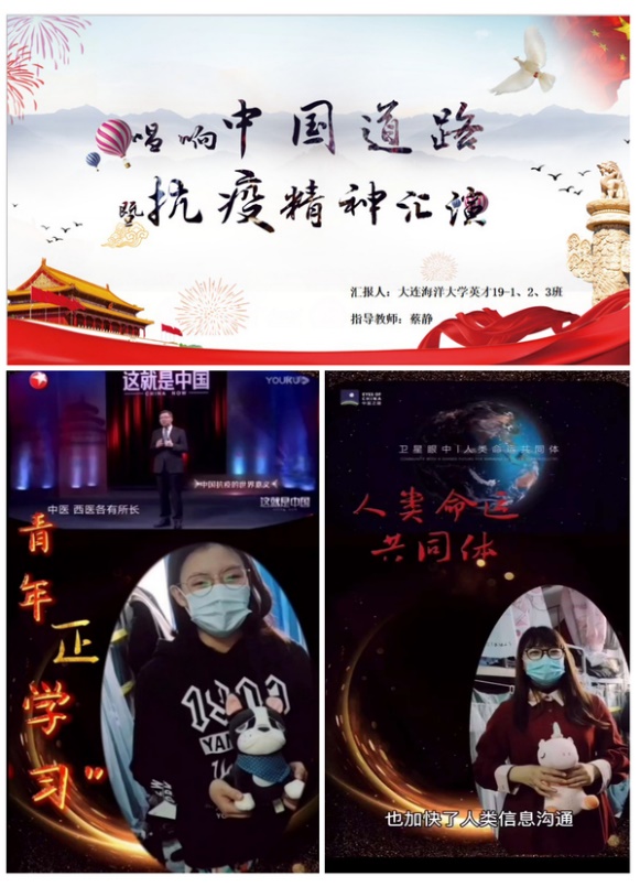 在《毛泽东思想和中国特色社会主义理论体系概论》最后一节课,蔡静老师以腾讯会议形式开展“唱响中国道路暨抗疫精神”汇演。参演的全体同学,用中英文演讲、实践成果展示、视频展播、朗诵以及歌曲等多种方式汇报演出,每个节目都饱含了我国在抗疫方面的正确领导与令人敬佩的抗疫精神,也更坚定了同学们用积极心态去面对疫情。