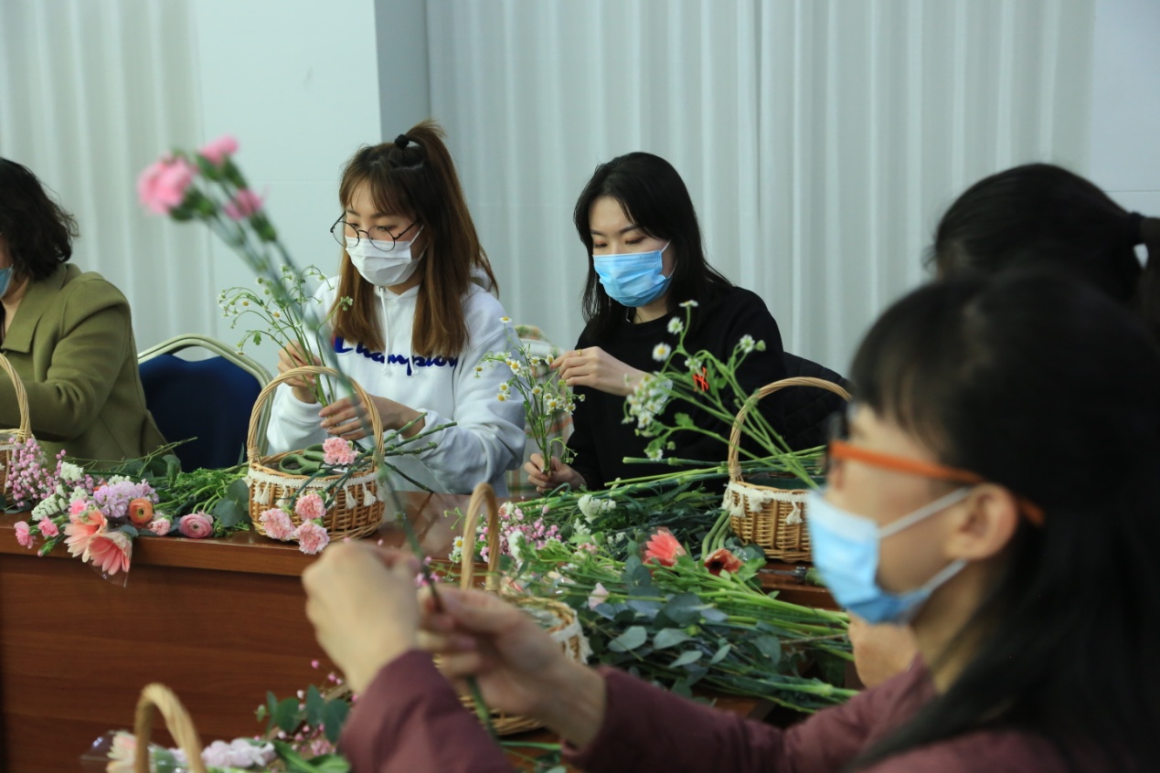 活动在轻松愉快的氛围中展开,石老师从鲜花养护、插花结构、艺术配色三个方面展开了讲解,教大家如何通过控制插花分割比例、色彩、主次关系、质感等方面来呈现出最美的插花效果。在石老师的示范指导下,女教职工们认真聆听,用心制作,从鲜花的构图、布局、取材、剪叶开始,经过不断的尝试与实践,一盆盆艳丽多姿、生机盎然的艺术插花作品呈现在大家眼前。