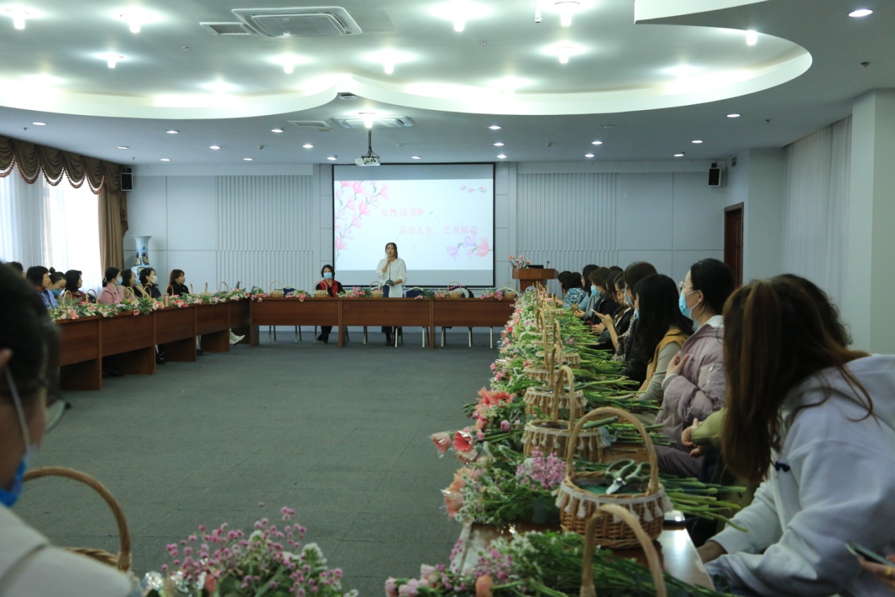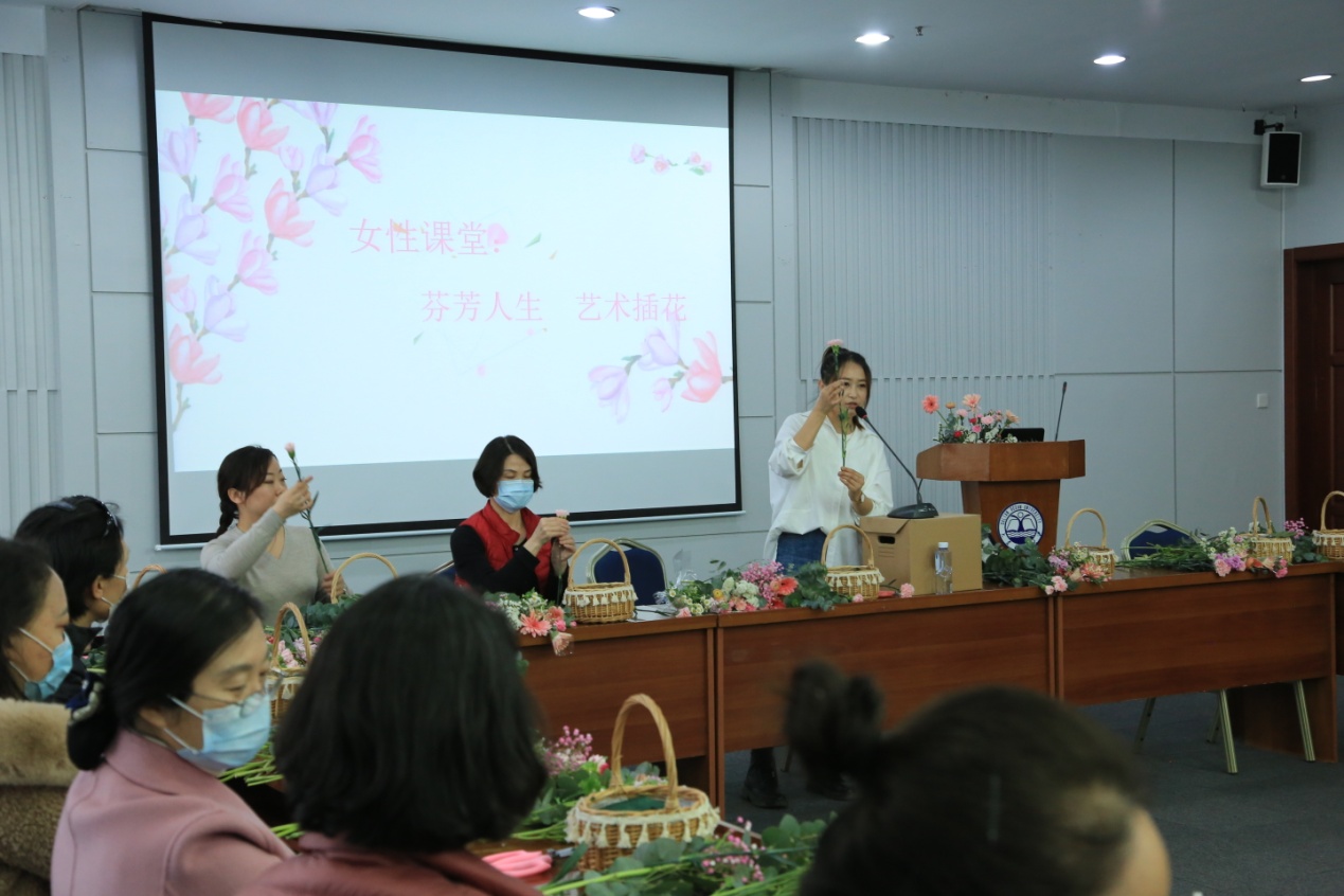 为庆祝第111个三八妇女节,进一步提升女教职工的高雅素养,培养女教职工的优雅气质,让女教职工在生活中发现美、学会美。3月12日下午,由3522vip浦京集团官网工会承办,校工会主办的女性课堂——“芬芳人生”艺术插花活动在图书馆多功能厅举行。邀请专业花艺培训室花艺师石晶女士现场授课,浦京官网各基层工会女职工代表50余人参加。