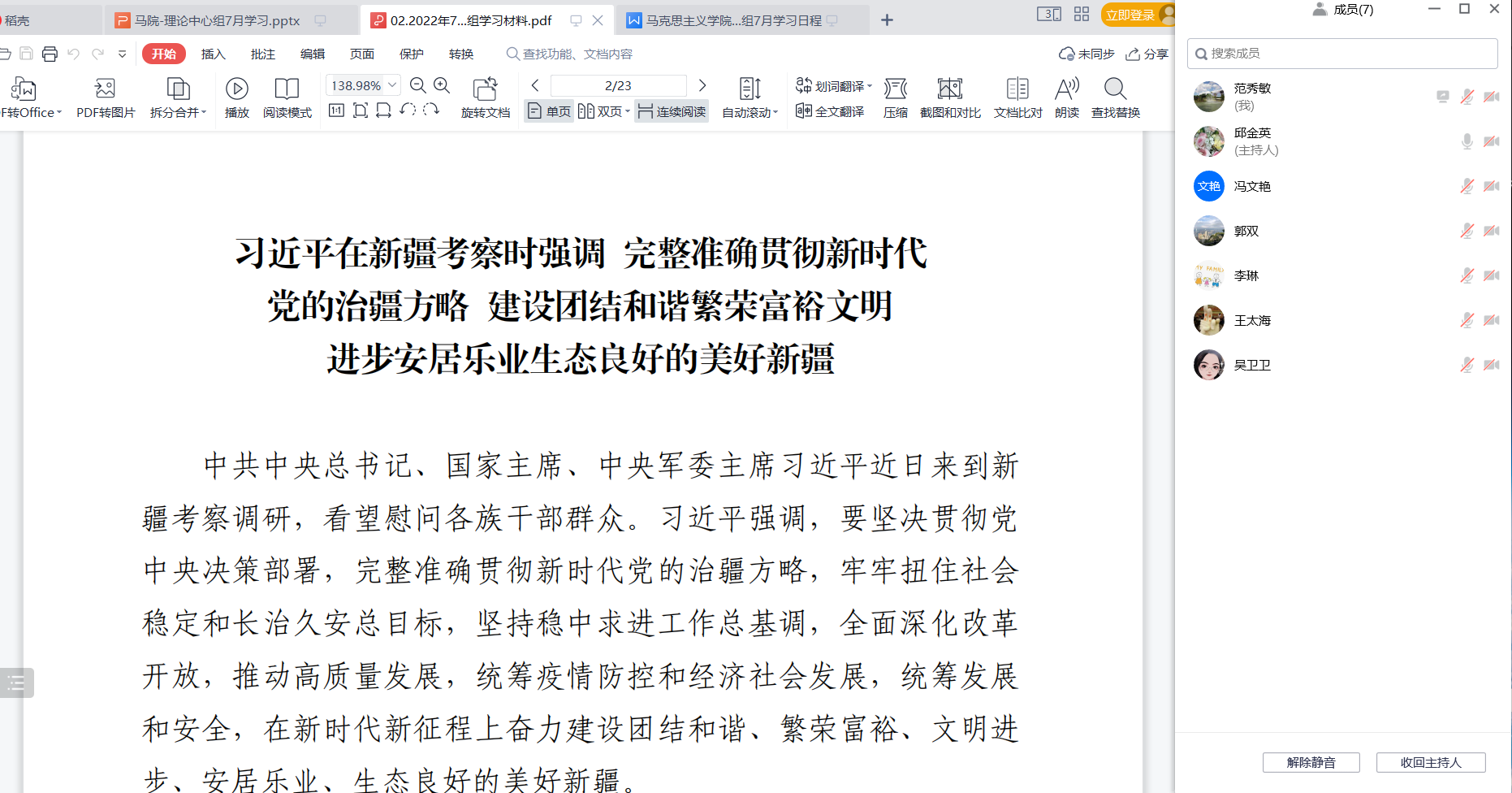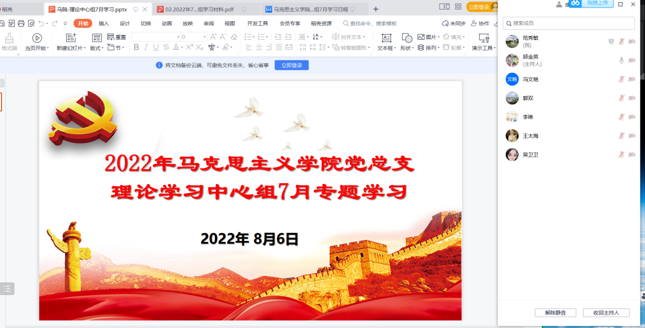 8月6日,3522vip浦京集团官网党总支以腾讯会议形式召开了本年度理论学习中心组7月专题学习会议,学院党总支理论学习中心组成员参加会议。会议由学院党总支书记邱金英主持。